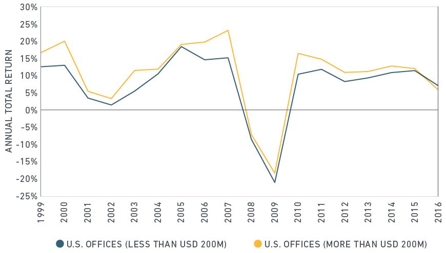 Since 1999, for example, U.S. office assets worth more than USD 200 million have outperformed smaller U.S. office assets in every year except 2016.1