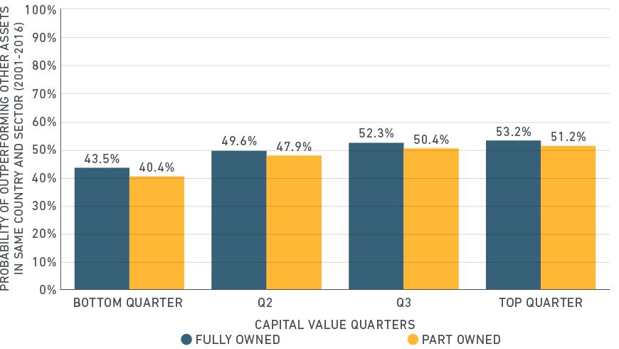 In addition, part ownership slightly reduced the chances of outperformance, though this effect appeared to be relatively small compared with the impact of asset size. To illustrate, a part-owned asset in the top capital value quarter still had a higher chance of outperforming than a fully owned asset in the first or second quarters.