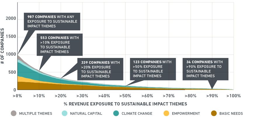 As the chart below shows, the MSCI ESG Sustainable Impact Metrics database includes 987 companies in the MSCI ACWI Index (about 40% of the index by number of companies as of March 1) that have estimated revenue tied to products and services that potentially advance the five themes outlined above. Of those companies, 123 derived at least half their revenue from exposure to sustainable impact themes, while 339 companies derived at least 20% of their revenue from such themes.