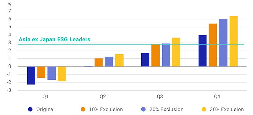The return enhancement was more significant for better-performing Asia ex-Japan funds: 146 bps and 241 bps per annum at 10% and 30% exclusion levels, respectively, for funds in the best-performing quintile.