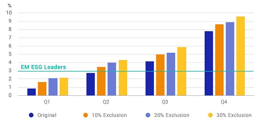Note: The exhibit above shows the annualized active performance of active EM funds versus the MSCI EM Index and active Asia ex-Japan funds versus the MSCI AC Asia ex Japan Index, during the period from December 2013 to December 2018. We grouped the funds into quartiles based on historical active performance: Q1 denotes the worst-performing group of funds, whereas Q4 denotes the best-performing group of funds. Three levels of ESG laggard exclusion were tested: 10%, 20% and 30%, where the ESG scores were neutralized for country, industry and size biases. The analysis is based on the MSCI Peer Analytics database.