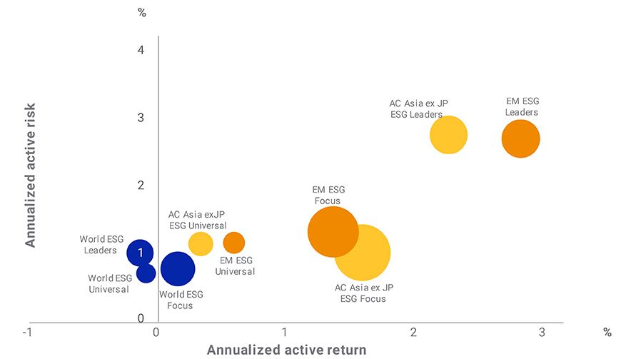 Consistent with our previous research, the MSCI ESG Leaders Indexes — a more concentrated index with best-in-class-security selection and higher tracking error — delivered larger active returns and risks in EM and Asia than the MSCI ESG Universal and MSCI ESG Focus indexes during this study period.