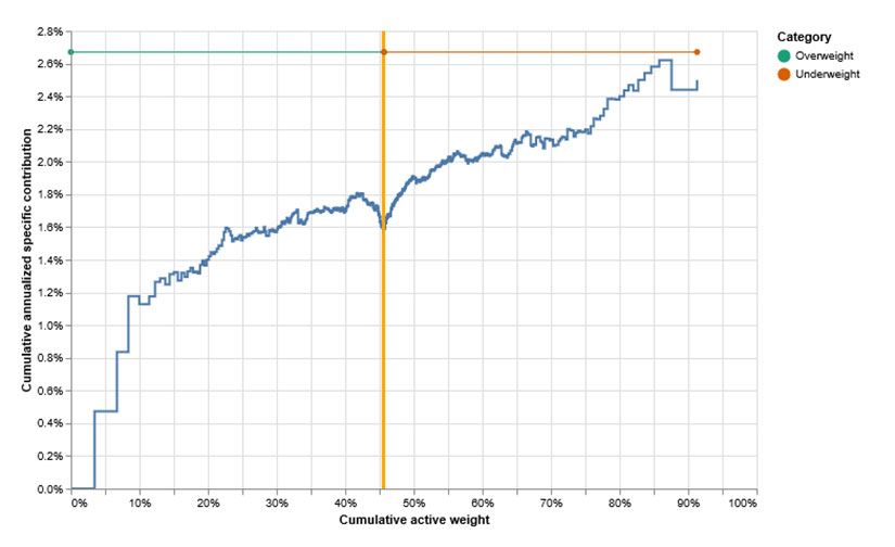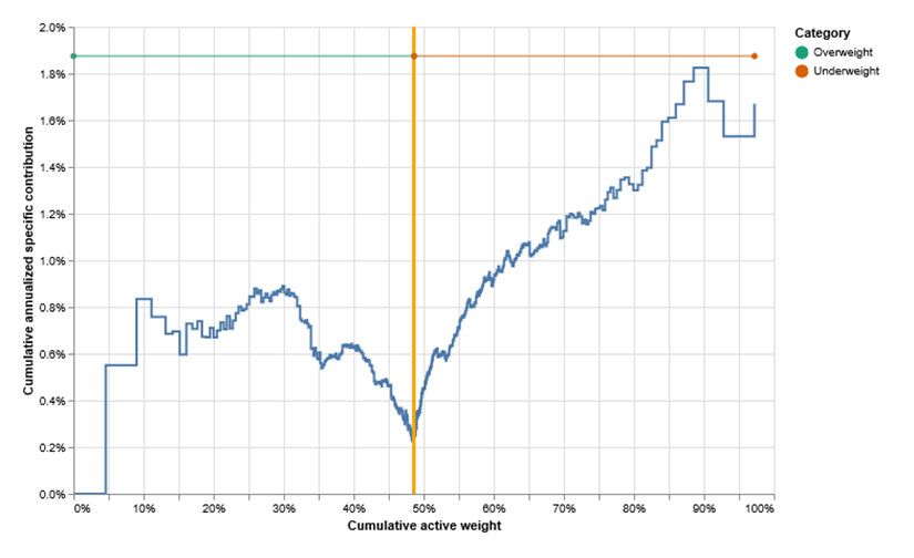 Data from Dec. 31, 2013, to Dec. 31, 2018. The exhibit shows cumulative annualized specific contribution of the MSCI EM ESG Leaders and MSCI AC Asia ex Japan ESG Leaders Index versus cumulative overweights and underweights (index constituents are sorted from largest to smallest active weight).