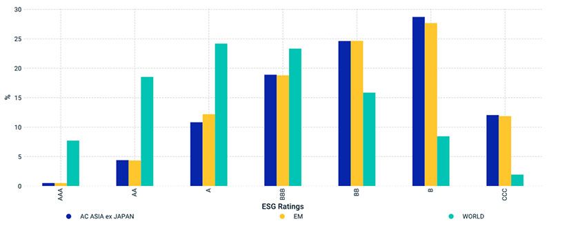 - MSCI ESG Ratings were generally lower for equities in emerging markets (EM) and Asia ex-Japan than they were for developed-market (DM) equities.
