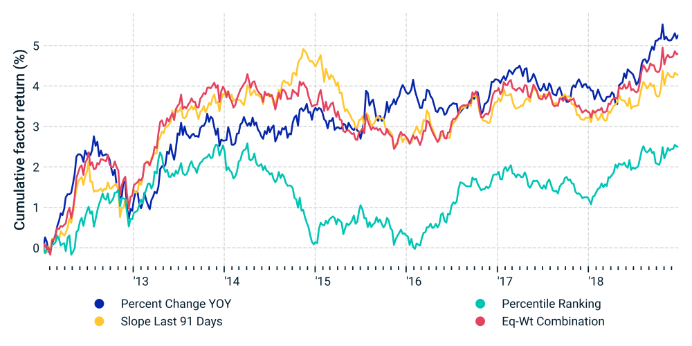 - Individual metrics and the equal-weighted combination had positive factor and quintile spread returns and positive information ratios.