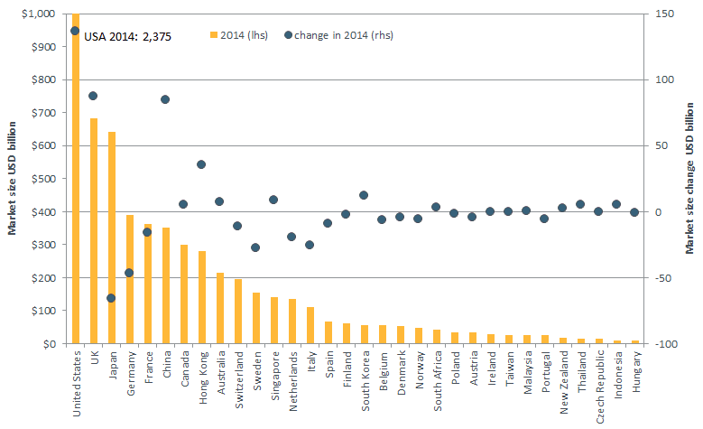 The U.S., estimated at $2.4 trillion, remained the largest market in 2014; its share of the IPD Global Annual Property Index grew to 39% from 37%, mainly due to the relative strengthening of the US Dollar. The U.K. moved into second position ahead of Japan, its weight increasing slightly to 11.2% ($680 billion). Conversely, Japan's weighting decreased slightly to 10.5% ($640 billion), as the yen declined.