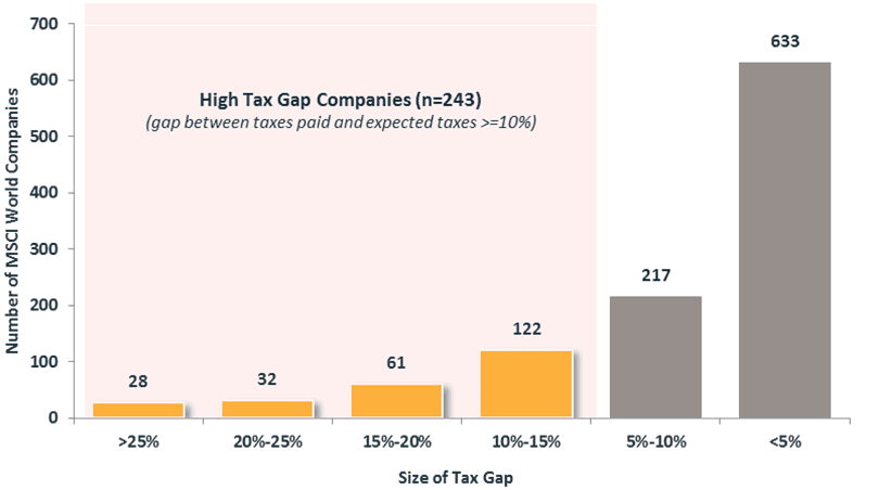 - Taxes paid by the 243 companies in the MSCI World Index with the largest tax gaps (defined as the difference between the reported tax rate paid and the tax rate of where companies generate revenues) would have totaled an estimated USD 82 billion per year in taxes, had these companies been paying taxes at the same rate as their peers in the MSCI World Index. If these taxes had been paid, it could have reduced aggregate profit after taxes across these 243 companies by approximately 20% over this period (Exhibit 1).