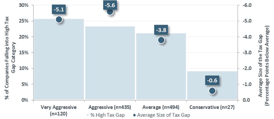 - Using MSCI ESG Research's forensic accounting (AGR) scores, we found that companies with very aggressive accounting ended up paying lower taxes, with a significantly higher proportion of high "tax gap" companies represented in the very aggressive accounting categories than the conservative accounting category (Exhibit 3).