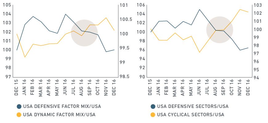 U.S. equity investors in 2016 experienced a roller coaster ride. The U.K.'s vote to leave the European Union and the U.S. presidential election each resulted in sharp market moves. Together, the two events contributed to a shift in the underlying fabric of equity markets starting in the second half of the year. While the Brexit vote created huge uncertainty in markets, particularly in Europe, the election of Donald J. Trump and an upbeat assessment by the Fed had an opposite effect: Institutional investors shifted their strategies toward U.S. companies that benefit from economic growth and away from minimizing risk. Money followed investor sentiment in primarily three ways: from defensive to cyclical sectors, from large-cap to small-cap stocks, and from defensive to cyclical (dynamic) factors. Our findings shed light on allocations across sectors, factors and the rest of the investment spectrum. The chart below shows the rotation in sectors and factors in the run-up to the U.S. election. Sectors and factors that reflect economic expansion found favor as investors prepared for what they perceived to be an incoming administration that would champion pro-growth policies.