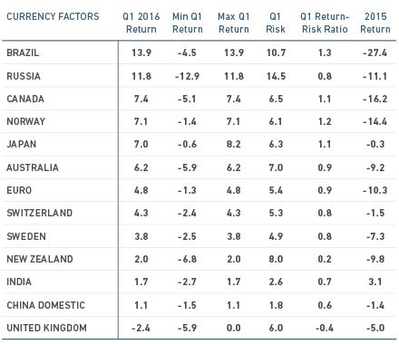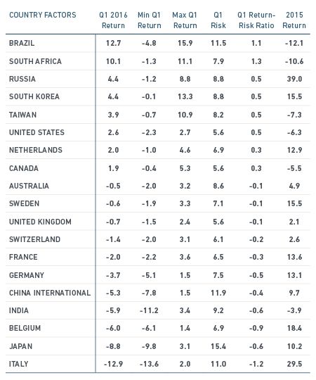 The Brazil equity factor rebounded over the quarter and returned 12.7% to erase a 12% loss in 2015. Despite the country's economic woes, investors may be pricing in prospects for a change in the government and reforms that could follow.