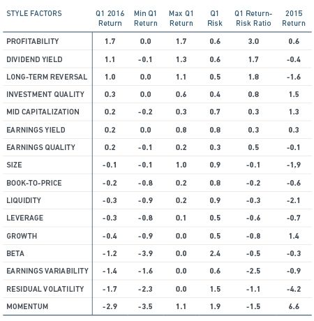 Overall, the performance of factors in the first quarter of 2016 reflected investors' concerns about future growth and their expectation of low inflation.