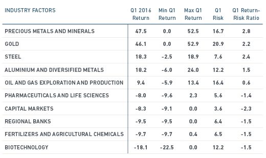 The quarter showed dispersion in the performance across industry factors (Exhibit 3). Returns on precious metals (47.5%) and gold (46.1%) topped the list as investors sought to insure against macroeconomic uncertainty. Returns for regional banks (-9.5%) and capital markets (-8.3%), which ranked among the worst-performing factors, appeared to reflect defaults in loans to borrowers hit by the falloff in oil prices and uncertainty about the long-term profitability of banks in a negative interest rate environment.