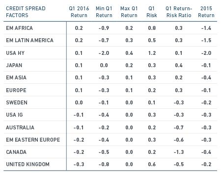 Credit spread factors changed little over the quarter (Exhibit 6). One exception: a divergence in spreads between the high-yield and investment-grade sectors in the U.S. The deviation reflected the impact of low oil prices on the high-yield issuers and flows of capital to investment-grade issuers in the U.S. and U.K. The change also reflected investors' searching for alternatives to negative rates on government bonds across most developed-market economies outside the U.S. and U.K.