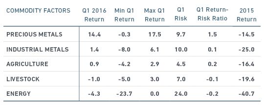 The energy factor dipped 4.3% during the first three months of 2016, which marked the fifth straight quarter of decline (Exhibit 8). Precious metals outperformed all other sectors. The rise reflected demand by investors for insurance in a market marked by macroeconomic uncertainty and volatility.