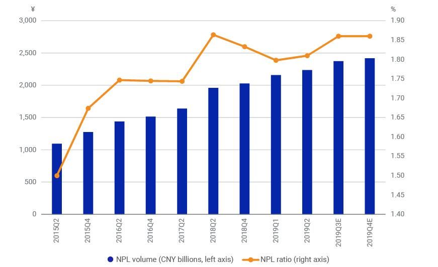 Volumes for the third and fourth quarters of 2019 are estimated from NPL ratio and outstanding loan volume. Source: International Monetary Fund, People's Bank of China, China Banking and Insurance Regulatory Commission