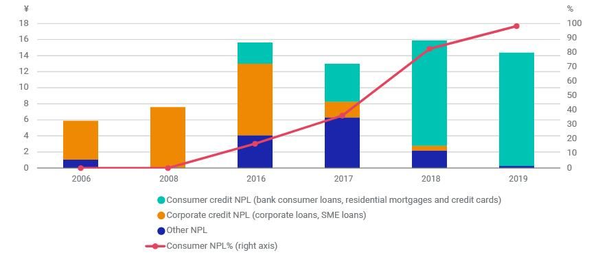 Total issuance of NPL ABS since 2006 is only CNY 72.2 billion, or less than 1% of the total Chinese ABS issuance of CNY 8 trillion. The exhibit below shows that consumer loans (bank consumer loans, residential mortgages and credit card loans, etc.) accounted for only 17% of the total NPL ABS issuance in 2016, but made up 98% of the total issuance in 2019.