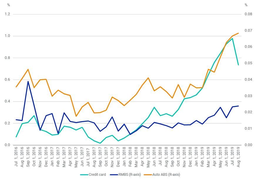 The exhibit below shows a rapid increase in overall consumer-loan delinquency, which may have helped fuel this trend in the issuance of NPL ABS. As we discussed in a previous blog post, the default rate for pre-2019-vintage auto loans have increased more than 100% from September 2018 to August 2019. For similar vintages, the default rate for loans backing credit-card ABS has increased 700% — more than eight times the average default rate between 2016 and 2017. Even for residential mortgages with the same vintages, which is often considered the safest consumer loan, the default rate was twice as high as the historical average through Dec. 31, 2018.