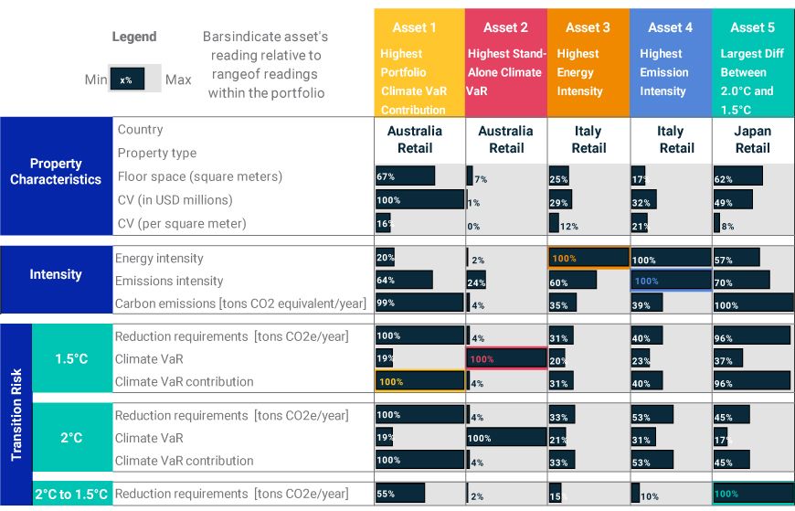 Climate-transition risk may not be equally distributed across real estate portfolios. It might be that the asset at most risk on a stand-alone basis has one of the smallest contributions to portfolio risk. Characteristics such as energy and emission intensity and capital value on an absolute and per-square-meter basis drive such results. Analysis of the type illustrated above could help investors plot their tailored course to net-zero carbon emissions for their own portfolios.