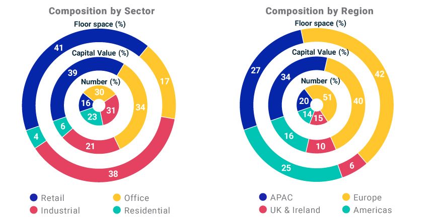 We constructed a simulated portfolio of 100 hypothetical assets using distributions of asset characteristics within the MSCI Global Annual Property Index. The exhibit below describes the portfolio composition by property type and geography measured by number of assets, capital value and floor space.