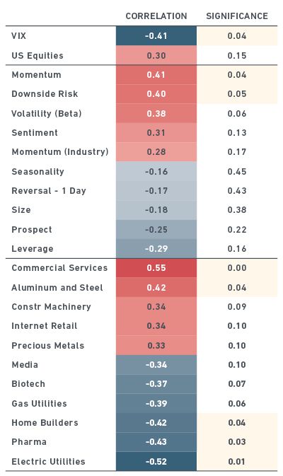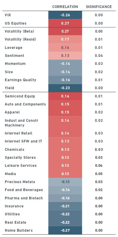 As the table suggests, based on the last 21 years, a rise in rates reflected a positive outlook for the economy and equity markets, as evidenced by the significant positive correlation (0.27) for the U.S. equities factor. In this environment, which was marked by reduced volatility, riskier assets (captured by volatility and leverage factors) tended to outperform, while factors such as earnings quality and large size – not surprisingly – tended to underperform.