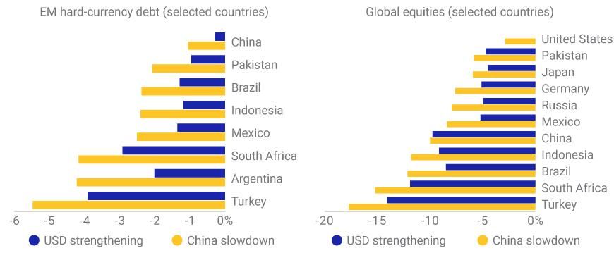 Emerging-market equities and USD-denominated EM sovereign bonds started 2019 with a bang, rising roughly 12% and 7%, respectively, through May 1.1 But recent market turbulence caused by the U.S.-China trade standoff raises a pressing question: What could trigger the next EM downturn? We defined two stress tests: a "U.S. dollar strengthening" stress test assuming that the USD appreciates relative to the yuan, the 10-year Treasury yield increases and U.S. equities remain flat; and a "China slowdown" scenario, in which Chinese equities drop sharply and the spread of USD-denominated Chinese debt widens, hurting both the U.S. and EM stock markets.