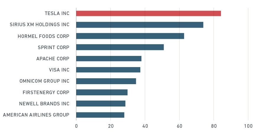 It's no wonder why the Tesla CEO tweeted about going private last week – the company is at the top of the list of short-selling targets from the U.S. large-cap equity universe. As of Aug. 10, 2018, it currently has the highest utilization rate, defined as number of shares shorted divided by number of shares available to short, as illustrated in the exhibit below: