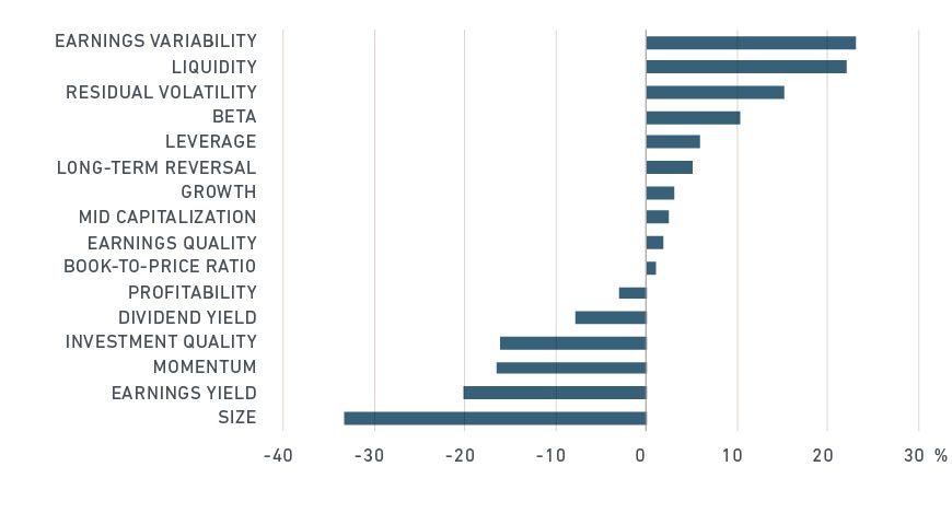 Short sellers tend to target companies with certain common characteristics. Our research shows1 that the utilization rate had positive correlation with the earnings variability, liquidity, residual volatility and beta factors while it was negatively correlated with size, earnings yield, momentum and investment quality. In other words, stocks favored by short sellers tend to have unpredictable earnings, volatile share price, high trading liquidity, rapidly growing assets and expensive valuations.