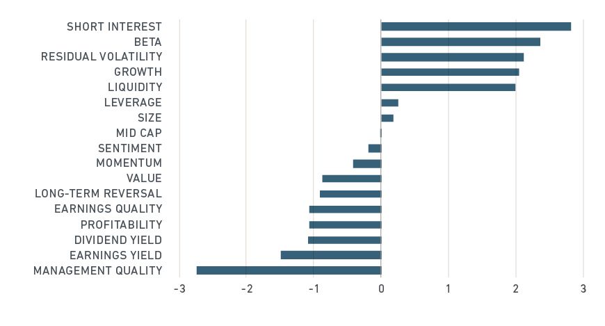 Tesla certainly fits this profile. It trades at high valuations and has high exposure to the liquidity, beta and residual volatility factors. In addition, it has negative exposure to quality, value and sentiment, which measures earnings revisions, news sentiment and options sentiment, as can be seen in the exhibit below.