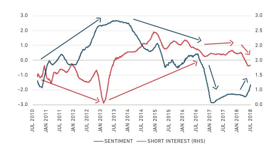 Mr. Musk may have a point — unless Tesla's characteristics change in the near term, it's hard to see how it won't continue to bait short sellers. Our analysis revealed that sentiment and short interest tended to move in opposite directions historically. In addition, sentiment has improved while short interest has declined modestly in recent weeks, suggesting slightly less pressure from short selling. As more details about the possibility of going private emerge in the coming weeks, Tesla will likely continue to attract attention and divide opinion among investors.
