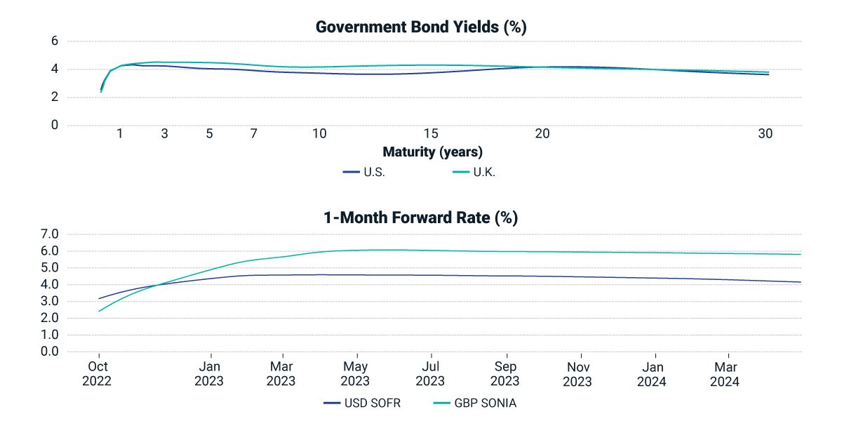 For example, realized inflation and forward-looking measures of inflation and interest rates embedded in yield curves suggest important similarities between the U.S. and U.K. Currently, the level and shape of the U.S. and U.K. government yield curves are remarkably similar (see figure below). And, as reflected in forward rates on USD SOFR and GBP SONIA, the market sees both the Fed and the BOE as willing to hike short rates to combat inflation. Indeed, the BOE rate increases are more aggressive, with GBP short rates expected to touch 6% while USD rates peak around 4.5%. Is the Fed's credibility with investors really that much greater than the BOE's?