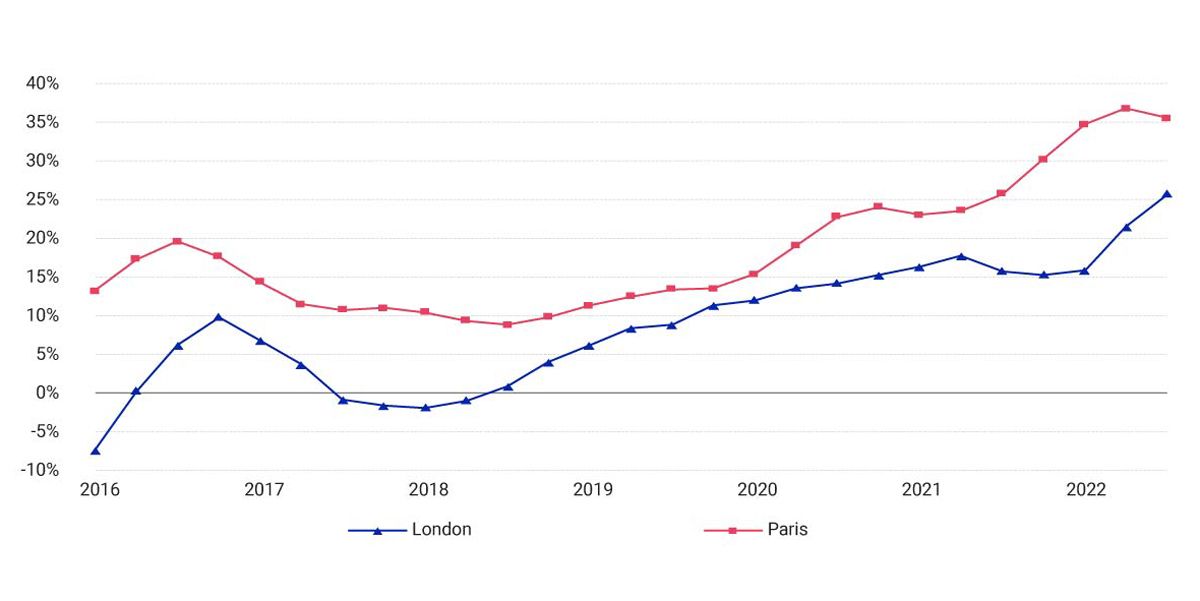 For Paris, the gap emerged in 2016, but has also grown significantly since 2019 and now stands at more than 35%. A premium at this level shows a considerable bifurcation in the market — and one that may continue, given the ongoing emphasis on decarbonization of property portfolios.