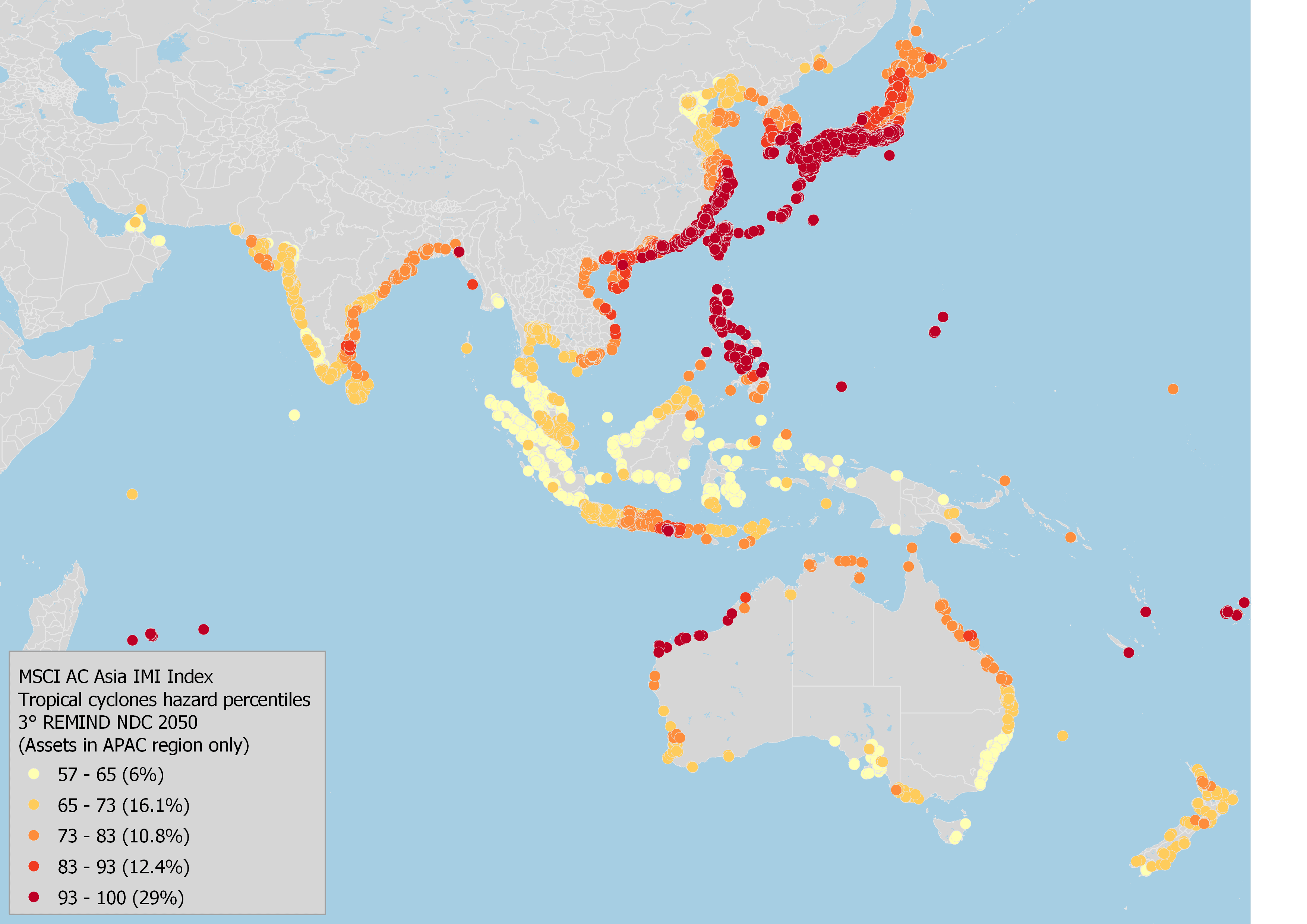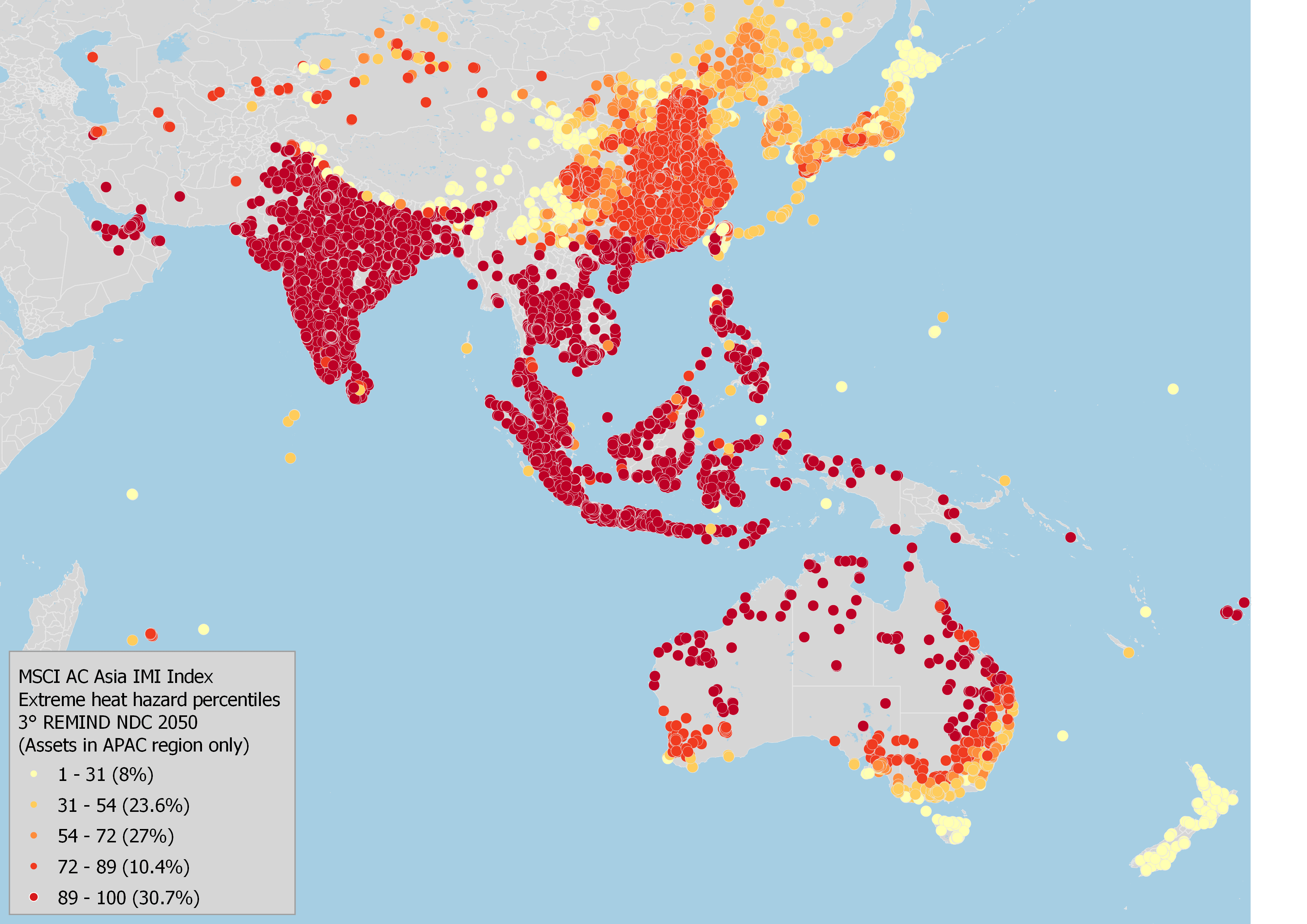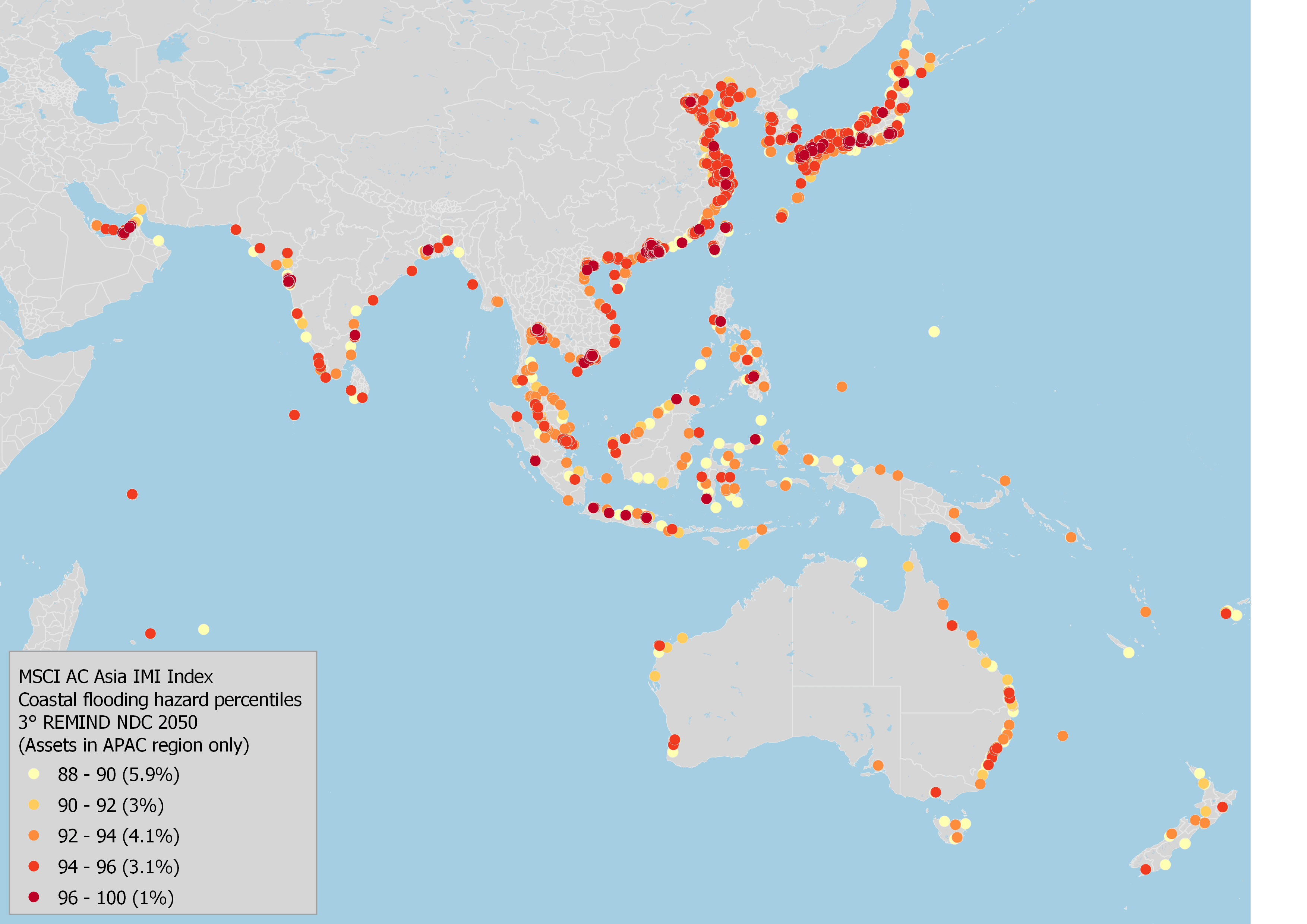 Hazard data is a key component of MSCI ESG Research's physical-risk modeling. The intensity and frequency of individual hazards strongly depend on the location of the asset and are projected to change over time depending on the underlying climate scenario. We mapped the physical assets operated by the constituents of the MSCI AC Asia Investable Market Index (IMI) to the most prevalent hazards in the region: extreme heat, tropical cyclones and coastal flooding. We used the hazard percentile data from the 3 degrees Remind Nationally Determined Contributions (NDCs) scenario and a 2050 timeline.