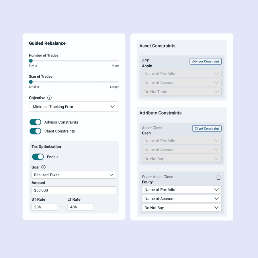 Assess the impact of portfolio changes on client goals, optimizing for taxes and transaction costs, with rebalancing to fit client needs.