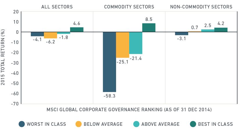 - Tide Turns on Credit?: Academic research indicates that strong governance mechanisms may have led to reduced default risk and lower bond yields. A recent study by Barclays also found that investment-grade bonds with higher ESG scores outperformed those with low ESG scores between 2007 and 2015. In 2016, we anticipate that if credit spreads widen, identifying ESG-related exposures and potential governance failures may play a bigger role as bond investors reprice underlying risks.