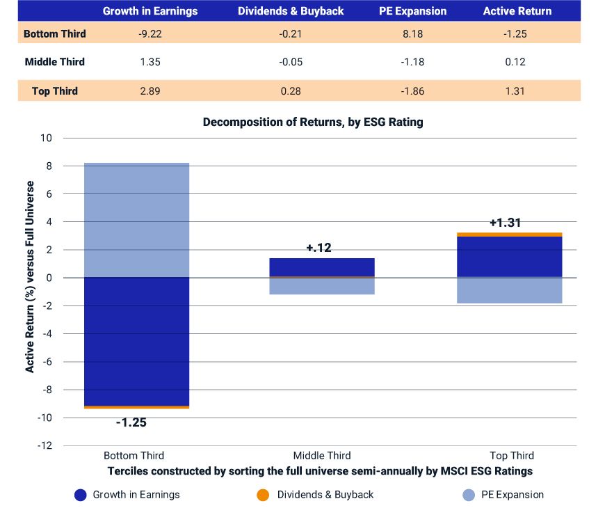 For starters, ESG investing is not another stock bubble. Below we see how the top third (T3), middle third (T2) and bottom third (T1) of companies in the MSCI ACWI Index, sorted by MSCI ESG Ratings, performed over a seven-year period. We found that the top third outperformed their peers due to higher earnings growth at the higher-rated companies while the middle third's performance was attributable largely to higher reinvestment returns from dividend payouts and share buybacks.