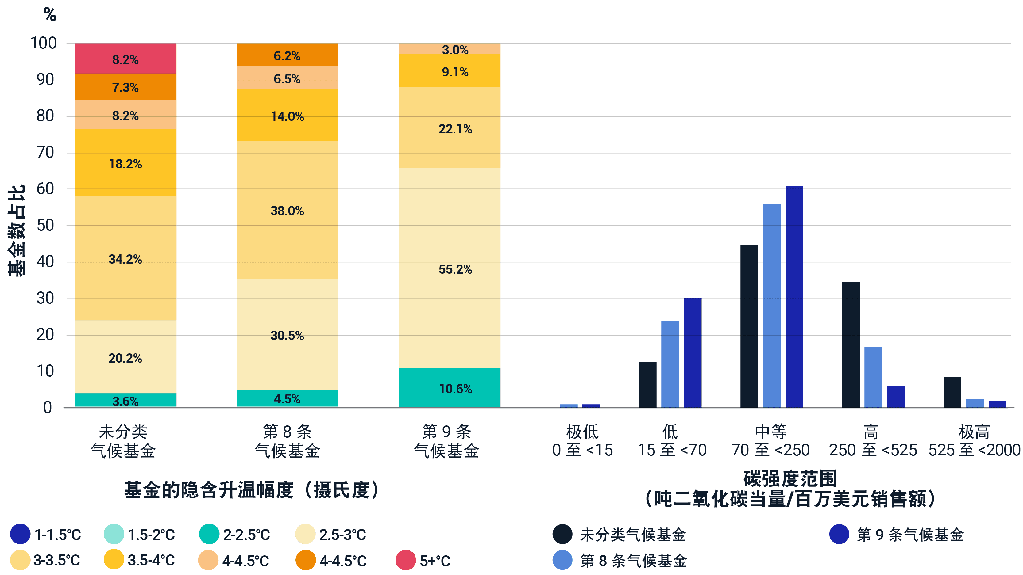 气候基金指产品名中有"气候"二字且投资策略纳入气候考量因素的共同基金和 ETF 。未分类气候基金 = 106 只,第 8 条气候基金 = 45 只,第 9 条气候基金 = 72 只。数据截至 2021 年 11 月 11 日。MSCI ESG Research LLC