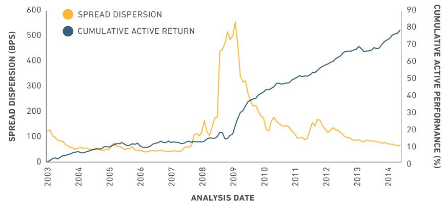 Understanding the performance of credit portfolios is essential in explaining a strategy's merits to clients and prospects. At the same time, analysts need to comprehend the portfolio's exposure to different sources of risk, identify unintended bets and clearly communicate risk forecasts. Integrating these processes to achieve a coherent, side-by-side attribution of both risk and return creates a powerful analytical tool. In a case study using BarraOne, we focus on a hypothetical corporate bond portfolio that uses a credit value strategy. The strategy aims to capitalize on credit risk exposure by selecting the bond with the largest spread from each duration-by-rating group in the benchmark. We assume that a bond with a high spread compared to similar bonds in its group will see its spread decrease and will mean revert towards the group average. Thus, the strategy aims to pick up alpha from spread return as spreads tighten on selected bonds (and their prices increase). In our analysis, we showed that the credit value strategy would have outperformed greatly from January 2003 to March 2014 and that performance improved significantly when the spread dispersion was greatest (see exhibit).