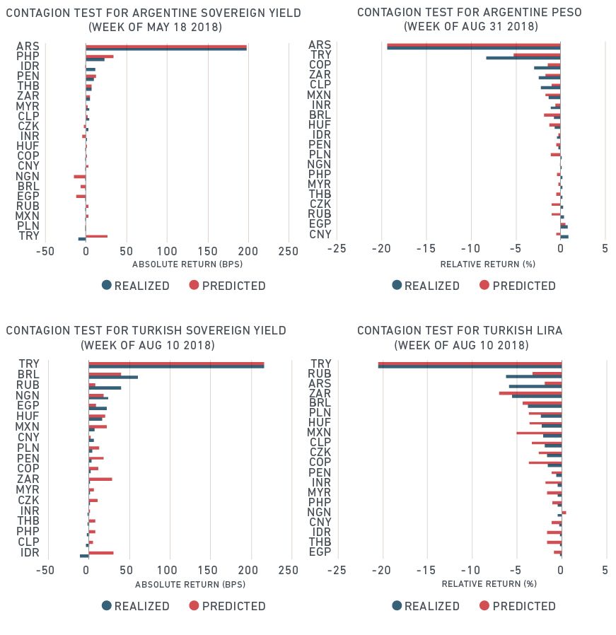 Our analysis indicates that there was not widespread contagion (our first category) to EM countries during the recent market corrections in Argentina and Turkey. In general, realized returns fell into one of the last two categories. For the Turkish lira, returns were mostly in line with historical sensitivities (category two); and for the other contagion tests returns were typically in line with the idiosyncratic interpretation (category three).