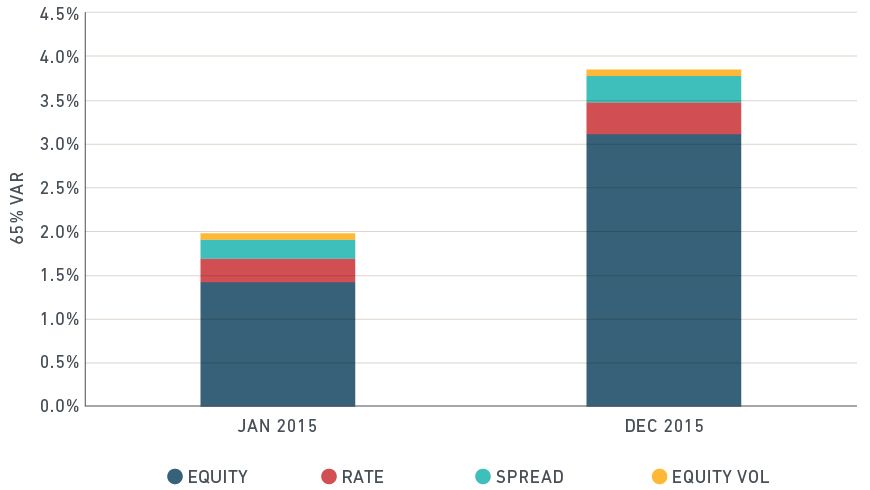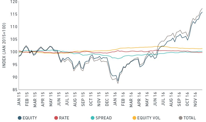 We use MSCI's recently updated model for convertibles to assess likely sources of risk over the next year. We first backtest the model to examine how well it predicted actual past returns. Our measure of ex-ante risk is 65% Value at Risk (VaR). As confirmed in the next chart, our model correctly identified equity risk as being the likely primary driver of returns for both 2015 and 2016.
