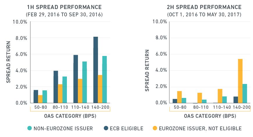 1 We looked at the euro corporate bond market as reflected by the Bank of America Merrill Lynch Euro Corporate Index. To measure spread performance, we apply our performance attribution model based on daily bond-level returns. We split the ECB-ineligible sector into non-eurozone issues and eurozone issues (primarily subordinates and bonds issued by banks). Bonds are also grouped according to their option-adjusted spreads (OAS) to better control for credit risk and liquidity. Note that OAS accounts for the impact of embedded options that are present in many fixed-income securities and is therefore a better measure of value than yield spread.