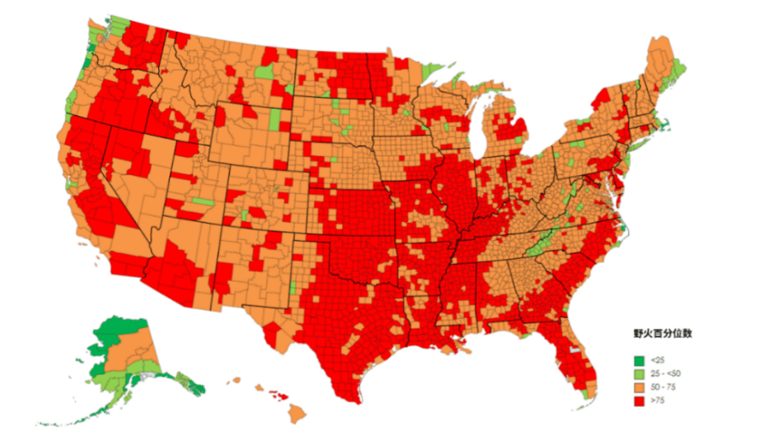以野火为例,根据绿色金融网络(NGFS)设定的国家自主贡献(NDC)3 degrees C的气候情景下,到2050年,美国44%的县(county)的灾害百分位数可能高于75。若某资产所在地区的灾害百分位数达75,这意味着该资产比参照数据集中75%的资产面临更多的野火风险(参考数据集指在当前气候条件下,MSCI ACWI指数成分股公司拥有的所有资产)。