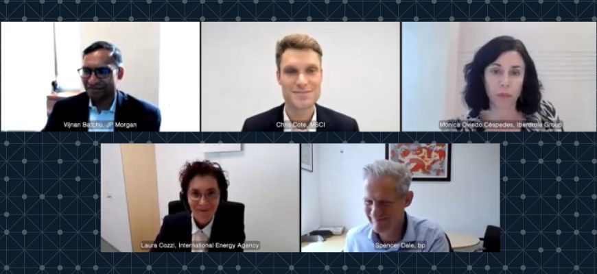 Clockwise from upper right: Monica Oviedo Céspedes, head of sustainability management, Iberdrola Group; Spencer Dale, chief economist, BP; Laura Cozzi, chief energy modeler, International Energy Agency; Vijnan Batchu, managing director, Center For Carbon Transition, J.P. Morgan; and Chris Cote, Americas ESG & climate research lead, MSCI Research