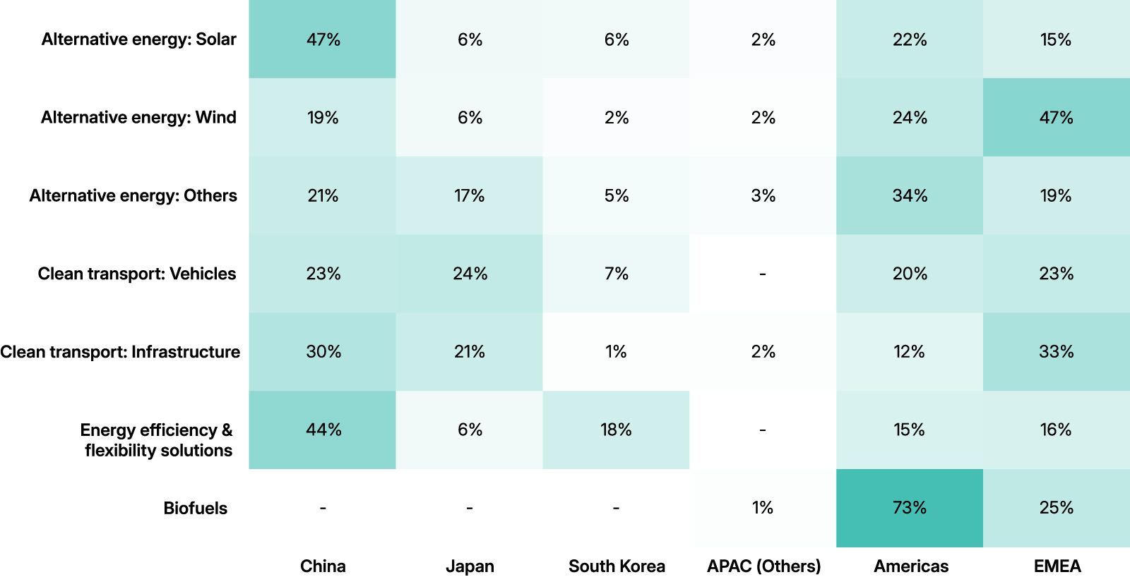 Despite trailing global peers on readiness metrics, APAC companies currently account for a large share of estimated revenues from key transition solutions, including solar power, energy efficiency and flexibility solutions, and clean transport. Chinese, Japanese and South Korean firms are both regional and global leaders, underscoring their pivotal role as providers of climate solutions.