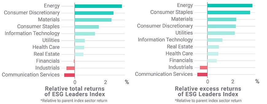 - Relative to the parent index, energy underperformed while IT and healthcare outperformed in Q1 2020. Most MSCI USD IG ESG Leaders Corporate Bond Index sectors outperformed the respective parent index sectors.