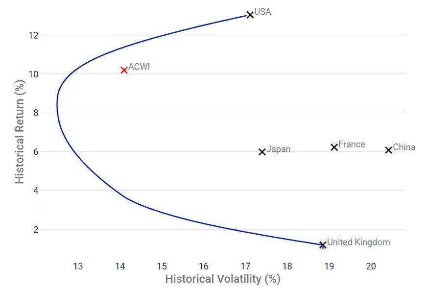 Efficient frontier with country allocations. Data from Jan. 1, 2014, to Nov. 30, 2021. Gross returns in USD. The five countries on average accounted for 74% of the weight in the MSCI ACWI Index.