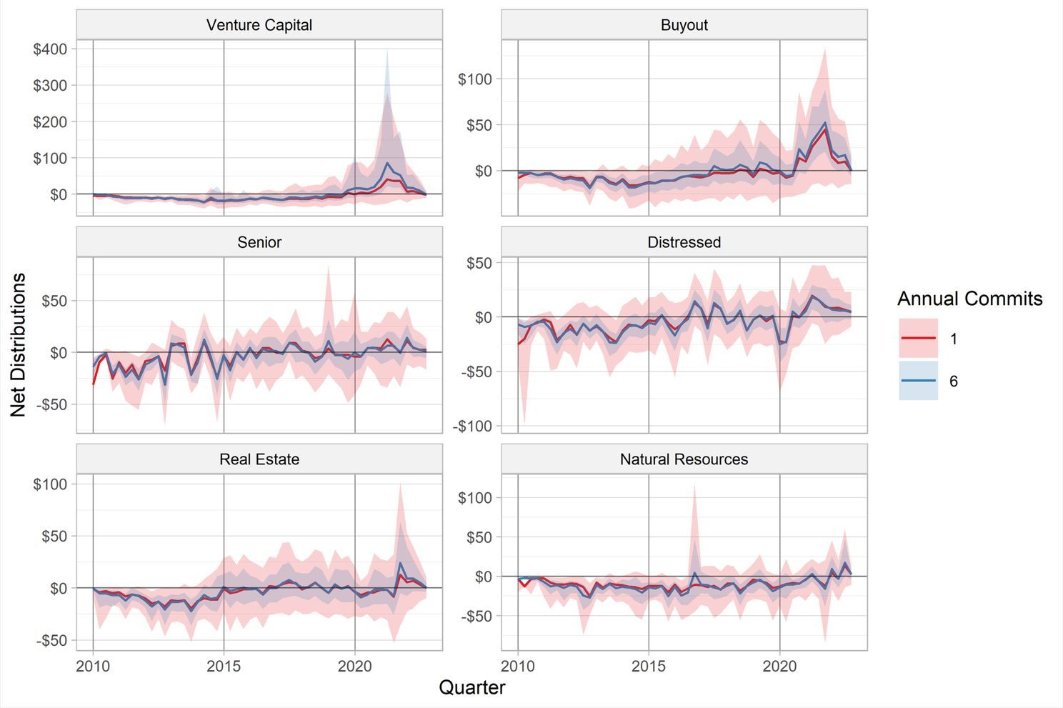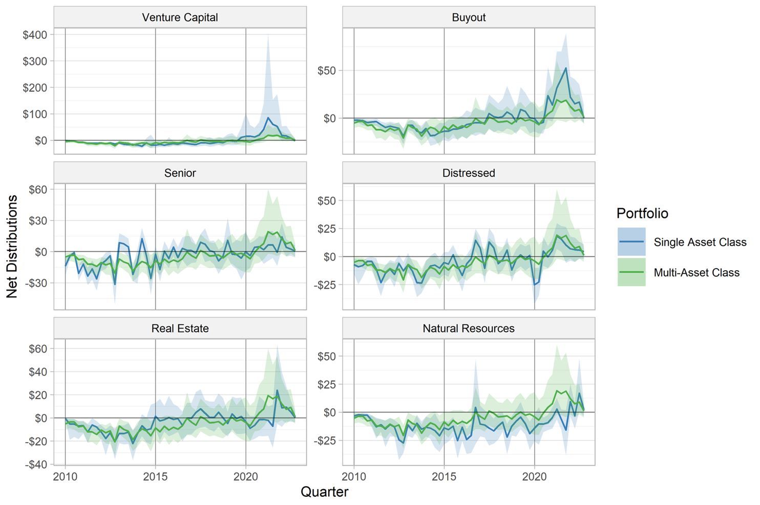 Quarterly cash flows from simulated asset-class portfolios committing to six funds per vintage, compared to cash flows from simulated portfolios that invest equally in one fund from each of these six asset classes per vintage. Commitments begin with the 2010 vintage. The lines denote the medians of each portfolio, and the ribbons indicate the 10th and 90th percentiles of the simulated portfolios. The multi-asset-class portfolio (green) is the same across all six panels.