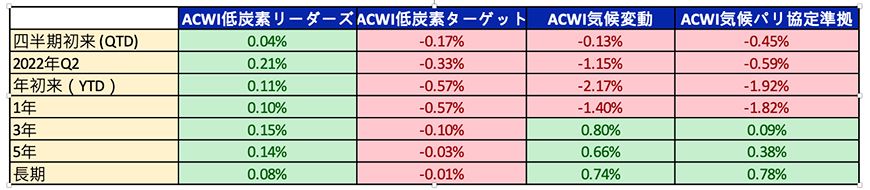 下表は各種MSCI ACWI指数の短期および長期のパフォーマンスを示しています。MSCI ACWIの気候変動指数および気候パリ協定準拠指数は長期的にMSCI ACWI指数をアウトパフォームしていますが、第2四半期にはMSCI ACWI指数をアンダーパフォームしました。この短期的なアンダーパフォームは第3四半期も続きましたが、 その度合いは小さくなっています。