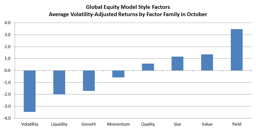 Similarly, industry factor performance in October reflected investors' rotation from more economically-sensitive, pro-cyclical sectors, such as materials and industrials to more defensive-oriented ones, such as utilities, consumer staples and telecommunications.
