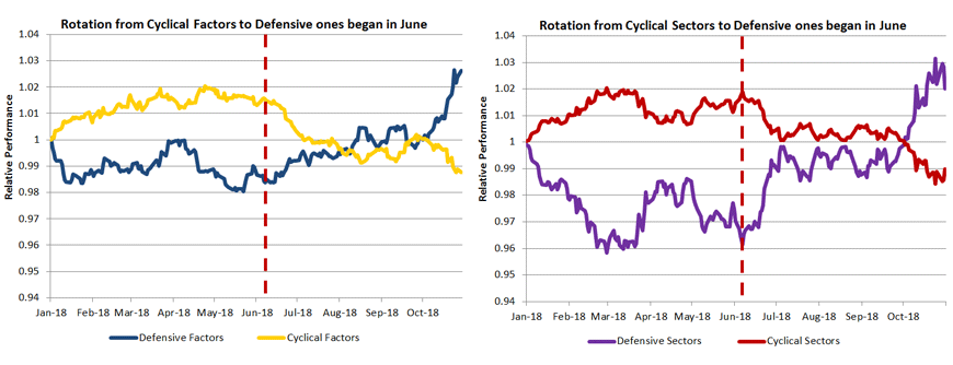 Data from January 2018 to October 2018. "Cyclical Factors" is represented as the equally weighted combination of the MSCI World Momentum Index, the MSCI World Equal Weighted Index and the MSCI World Enhanced Value Index. "Defensive Factors" is represented as the equally weighted combination of the MSCI World Minimum Volatility Index, the MSCI World High Dividend Yield Index and the MSCI World Quality Index. "Defensive Sectors" is represented as the free float market capitalization weighted combination of the following MSCI World Index sectors: energy, consumer staples, health care, telecommunications and utilities. "Cyclical Sectors" is represented as the free float market capitalization combination of the following MSCI World Index sectors: materials, industrials, consumer discretionary, financials, information technology and real estate.