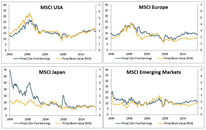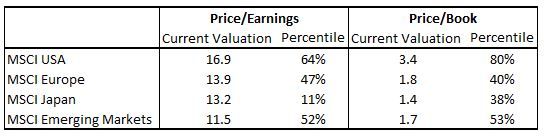When we look at where current valuations for each region, as of the end of July 2018, rank within its own history, the U.S. seems overvalued with current valuations in the 64th percentile on a price/earnings basis and the 80th for price/book; emerging markets and Europe remain in the 50s and 40s ranges, respectively. Japan, in contrast, appears relatively undervalued on both valuation measures.